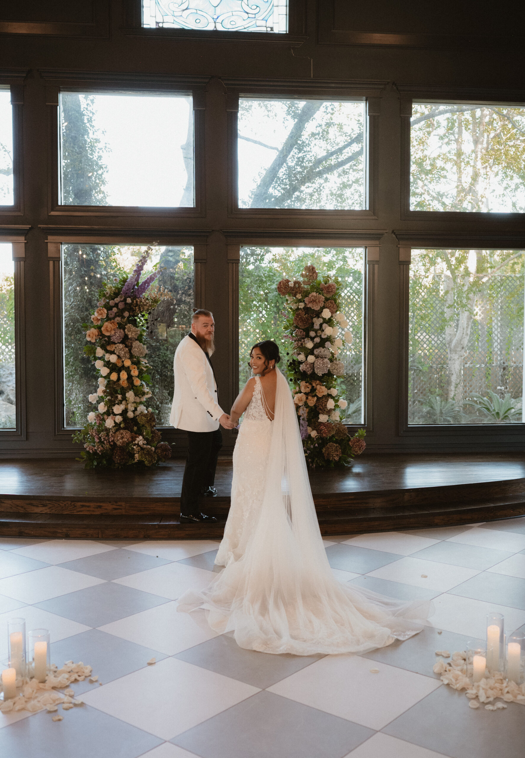 Walk down the aisle in our glamorous Chapel showcasing deep rich tones, modern chandeliers, and a grand entrance of mirrored doors sure to amaze every guest. The tall windows at the sides and front of the sanctuary look out onto our gardens and flood the room in soft, natural light. Above the stage sits one of our elegant stained-glass windows over the luscious green backdrop of hidden venue oasis.