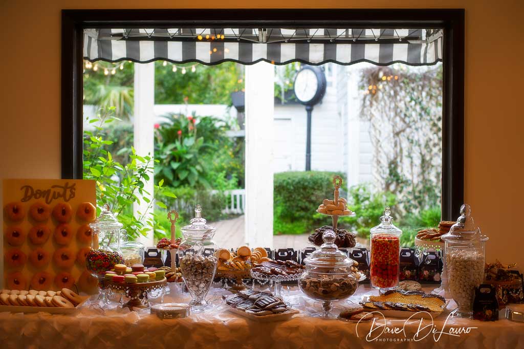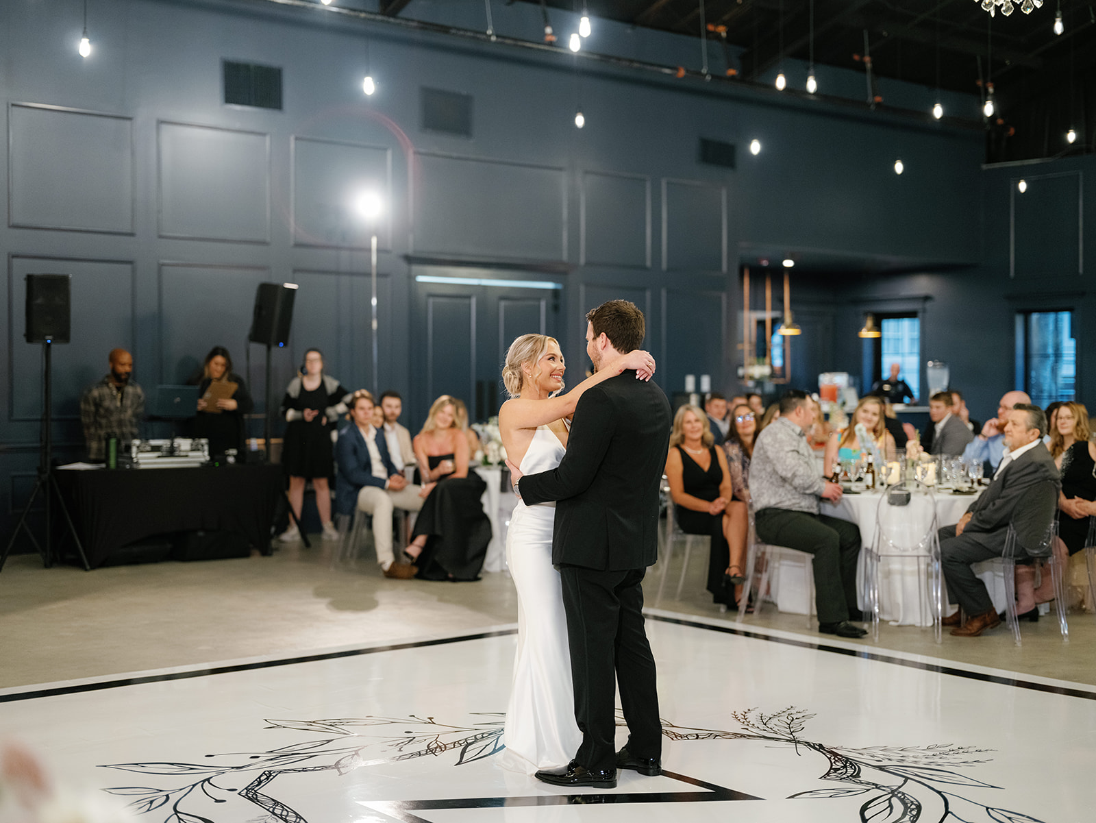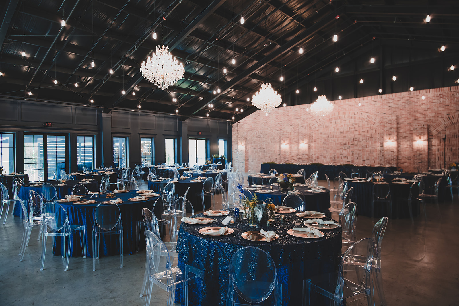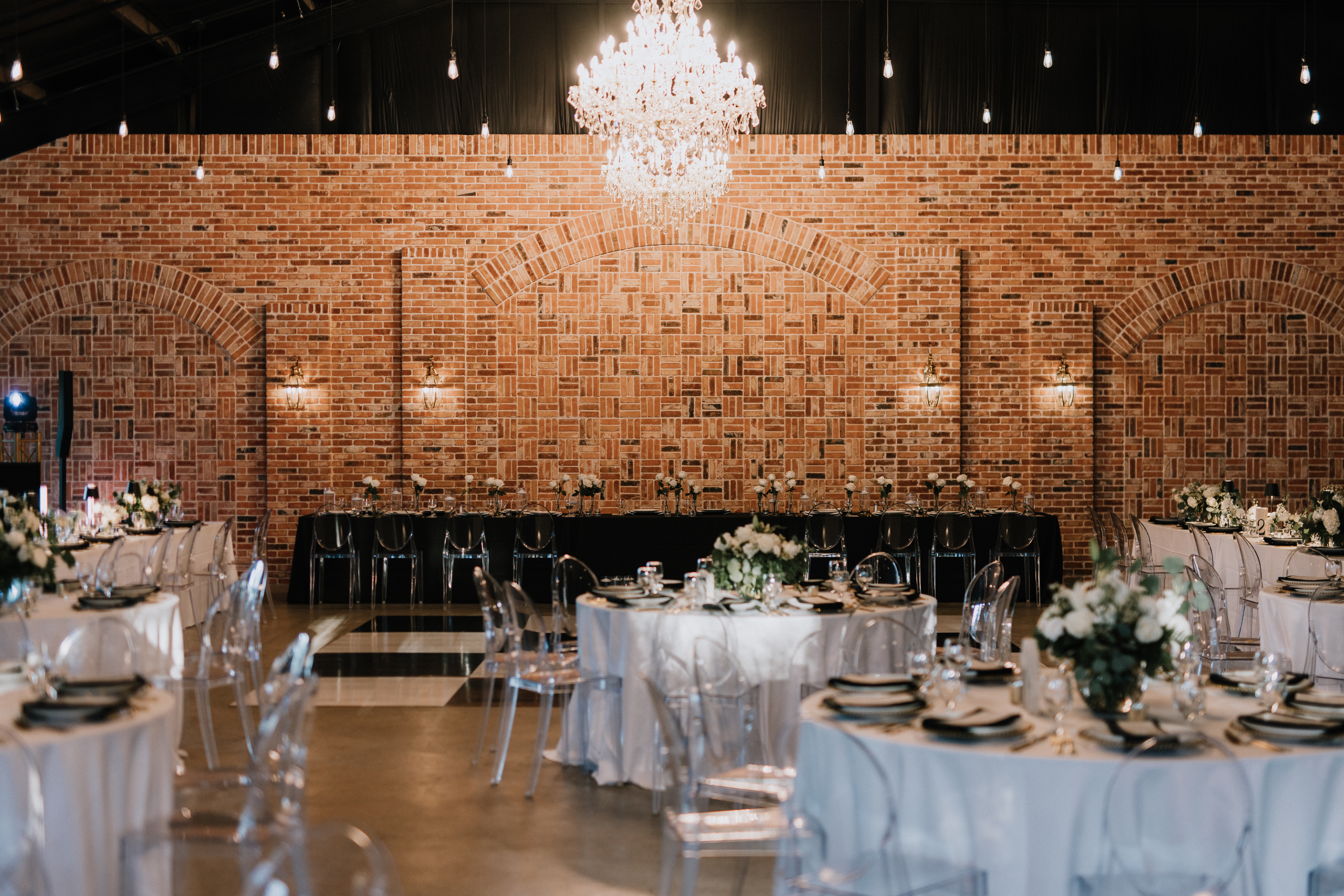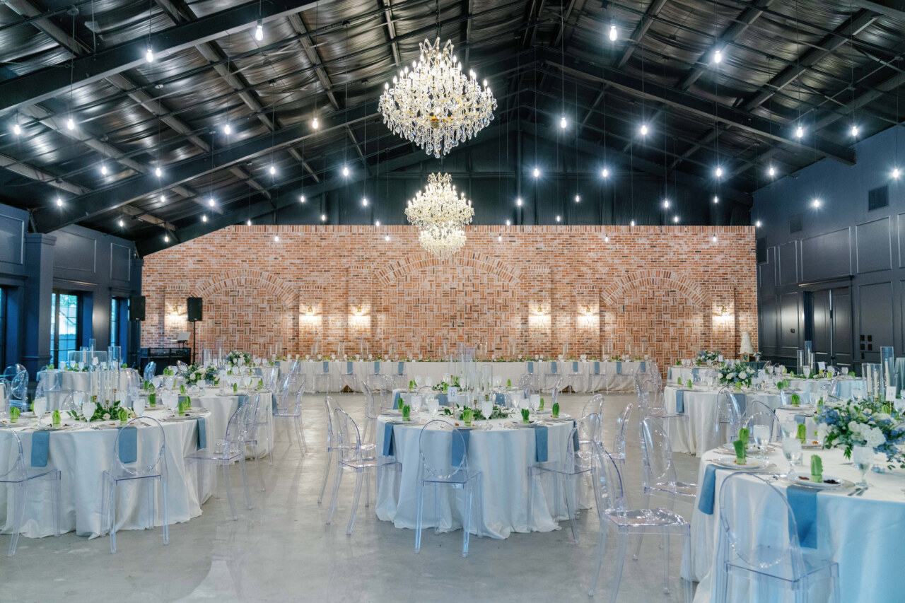 Our Reception Hall is a completely reimagined space for drinks, dinner, and dancing as you celebrate your wedding vows. Take in the groin ceilings, an architectural highlight that allows the perfect glow from our softly lit chandeliers. Impressive wooden beams, trimmed-out wooden columns, and an entire wall of exposed brick make quite the backdrop for your first dance, bouquet toss, and other favorite wedding traditions. Guests will also enjoy our bar made with antique glass situated in the back corner.